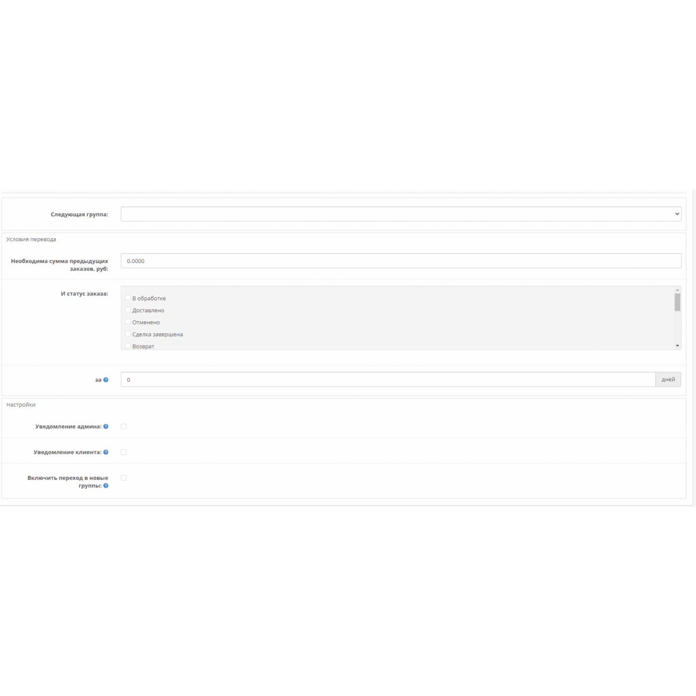 Для установки Автопереход клиентов по группам на ваш сайт, работающий на платформе Opencart или другой поддерживаемой платформе, необходимо выполнение определенных системных требований. Вы можете найти подробные инструкции по установке и системные требования на странице продукта или в документации к Автопереход клиентов по группам.