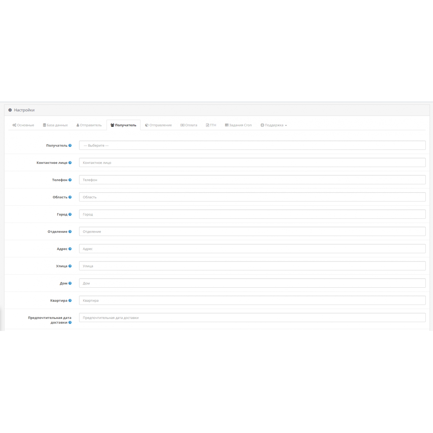 ◾️Настройка параметров получателя: получатель, контактное лицо, телефон, область, город, отделение, адрес, улица, дом, квартира, желаемые дата и время доставки.