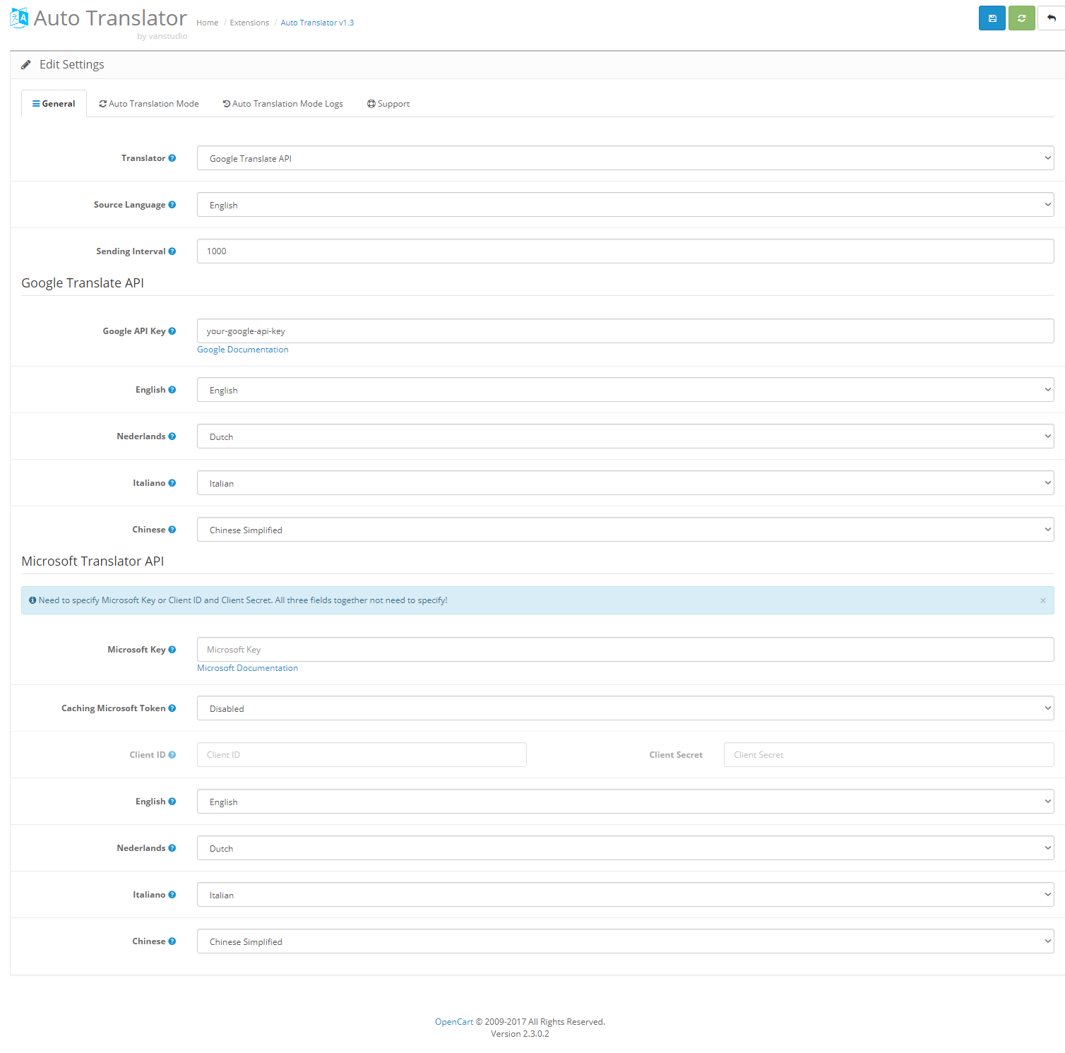Module Auto Translator allows translate all multilingual fields in opencart admin panel (default) . Administrator can translate fields (name, description, title, meta title, keywords, etc.) on edit page or use the automatic translation mode (bulk) in module settings.